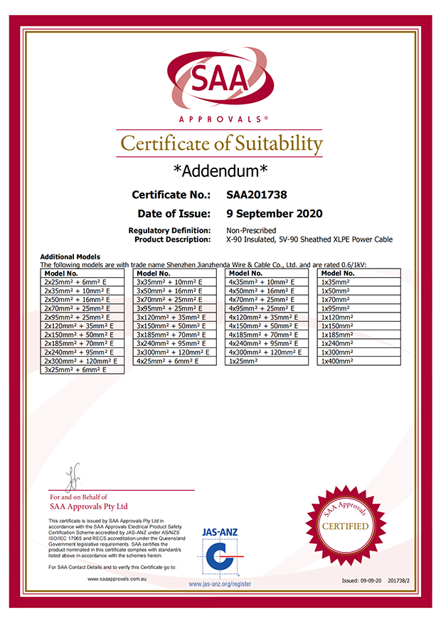 深圳建圳達電線電纜有限公司,成立于2000年,是一家電線電纜制造商,我們通過了世界各地不同市場的多數認證,如:CCC、RoHS、CB、SAA、TUV、VDE、PSE、BPS、UL、CSA。我們根據定制產品不斷更新新的認證。經過數十年的發展,我們與來自世界各地的客戶建立了長期的合作關系。我們曾經是菲律賓機場,,柬埔寨的電力站,美國的醫院,工廠,埃塞俄比亞的水電站項目。我們是一家值得信賴的電線供應商。